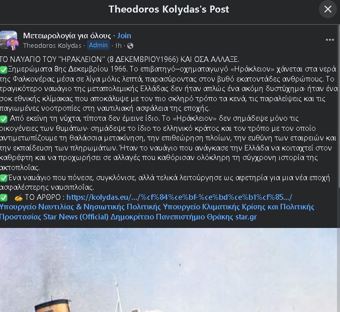 «Το επιβατηγό–οχηματαγωγό Ηράκλειον χάνεται στα νερά της Φαλκονέρας μέσα σε λίγα μόλις λεπτά, παρασύροντας στον βυθό εκατοντάδες ανθρώπους. Το τραγικότερο ναυάγιο της μεταπολεμικής Ελλάδας δεν ήταν απλώς ένα ακόμη δυστύχημα. Ήταν ένα σοκ εθνικής κλίμακας που αποκάλυψε με τον πιο σκληρό τρόπο τα κενά, τις παραλείψεις και τις παγιωμένες νοοτροπίες στη ναυτιλιακή ασφάλεια της εποχής» αναφέρει στην ανάρτησή του.