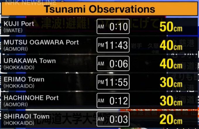 Κύματα τσουνάμι έκαναν την εμφάνισή τους στη βόρεια Ιαπωνία μετά τη σεισμική δόνηση, τα οποία διαφέρουν σε ύψος ανά περιοχή.