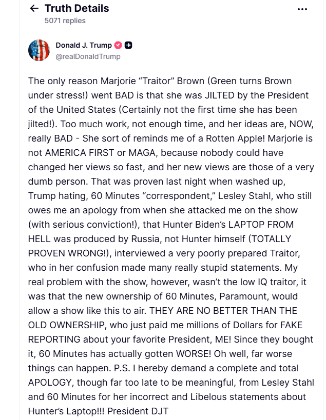 Στη σημερινή ανάρτησή του στο Truth Social, ο Αμερικανός πρόεδρος έγραψε: «Το πραγματικό πρόβλημά μου με την εκπομπή, εντούτοις, δεν ήταν η προδότρια με το χαμηλό IQ, ήταν ότι η νέα ιδιοκτησία του 60 Minutes, η Paramount, επέτρεψε ένα σόου σαν αυτό να προβληθεί. Δεν είναι καλύτεροι από την παλιά ιδιοκτησία, που μόλις με πλήρωσε εκατομμύρια δολάρια για ψευδή ρεπορτάζ σχετικά με τον αγαπημένο πρόεδρο, Εμένα! Από τότε που το αγόρασαν, το 60 Minutes χειροτέρευσε!».