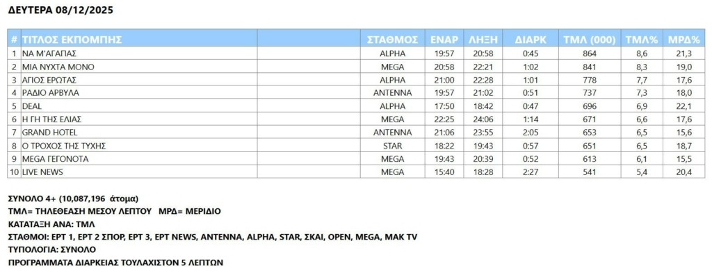 Το ενημερωτικό ντουέτο «Live news» – κεντρικό δελτίο ειδήσεων του Mega ολοκλήρωσε την κορυφαία 10άδα της Δευτέρας και ήταν οι ειδησεογραφικές εκπομπές με τα περισσότερα βλέμματα, στην κατηγορία τους.