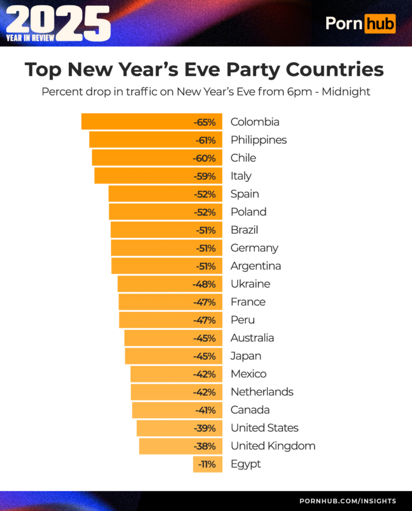Για την Πρωτοχρονιά η μείωση θεωρείται «φυσιολογική» για την ιστοσελίδα καθώς από τις 6 το απόγευμα της 31ης Δεκεμβρίου καταγράφηκε σημαντική πτώση ιδίως στην Κολομβία, όπου μειώθηκε κατά –65%, στις Φιλιππίνες και τη Χιλή με μείωση κατά –61% και –60%.