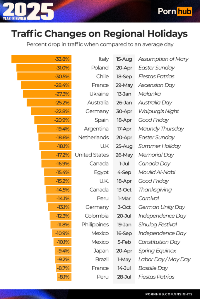 Στη φετινή ανασκόπηση αποτυπώθηκε για άλλη μια φορά ότι οι εθνικές εορτές αλλά και η Πρωτοχρονιά έχουν επίπτωση στον αριθμό των επισκεπτών του Pornhub.