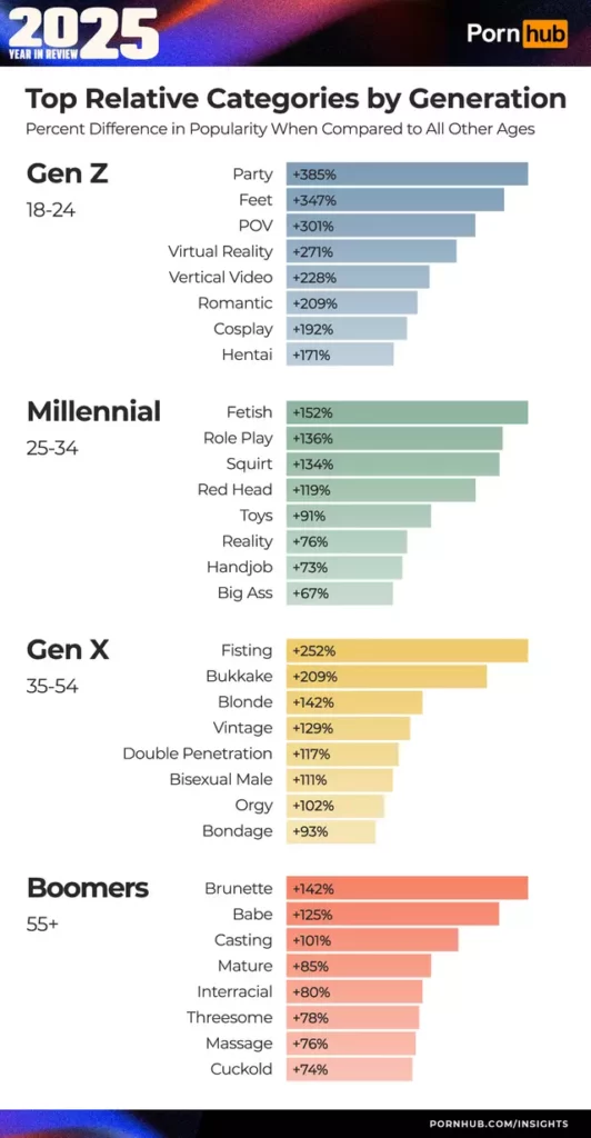 Επιπλέον, η κατηγορία Trans έγινε η δεύτερη πιο δημοφιλής κατηγορία της χρονιάς, υπογραμμίζοντας την αυξανόμενη δημοτικότητα του περιεχομένου LGBTQ+. Υποστηρίζοντας αυτή την τάση, οι αναζητήσεις για όρους όπως «trans threesome» αυξήθηκαν κατά 67% και «trans amateur» κατά 49%.