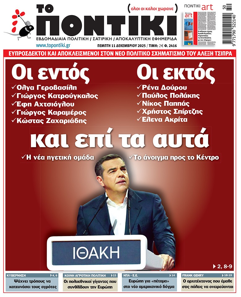 Με πρωτοσέλιδο τίτλο «Οι εντός, οι εκτός και τα επί αυτά» και αναλυτικό – αποκαλυπτικό ρεπορτάζ για τους ευπρόσδεκτους και τους αποκλεισμένους στον νέο πολιτικό σχηματισμό του Αλέξη Τσίπρα, αλλά και για τη νέα ηγετική ομάδα και το άνοιγμα προς το κέντρο, κυκλοφορεί το «ΠΟΝΤΙΚΙ» το πρωί της Πέμπτης.