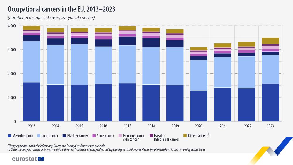 Αναλυτικά, μεταξύ 2013 και 2023, καταγράφηκαν 40.538 κρούσματα επαγγελματικών καρκίνων στην Ευρωπαϊκή Ένωση. Μόνο το 2023, αναγνωρίστηκαν 3.500 κρούσματα, 191 περισσότερα από ό,τι το 2022 (3.309).