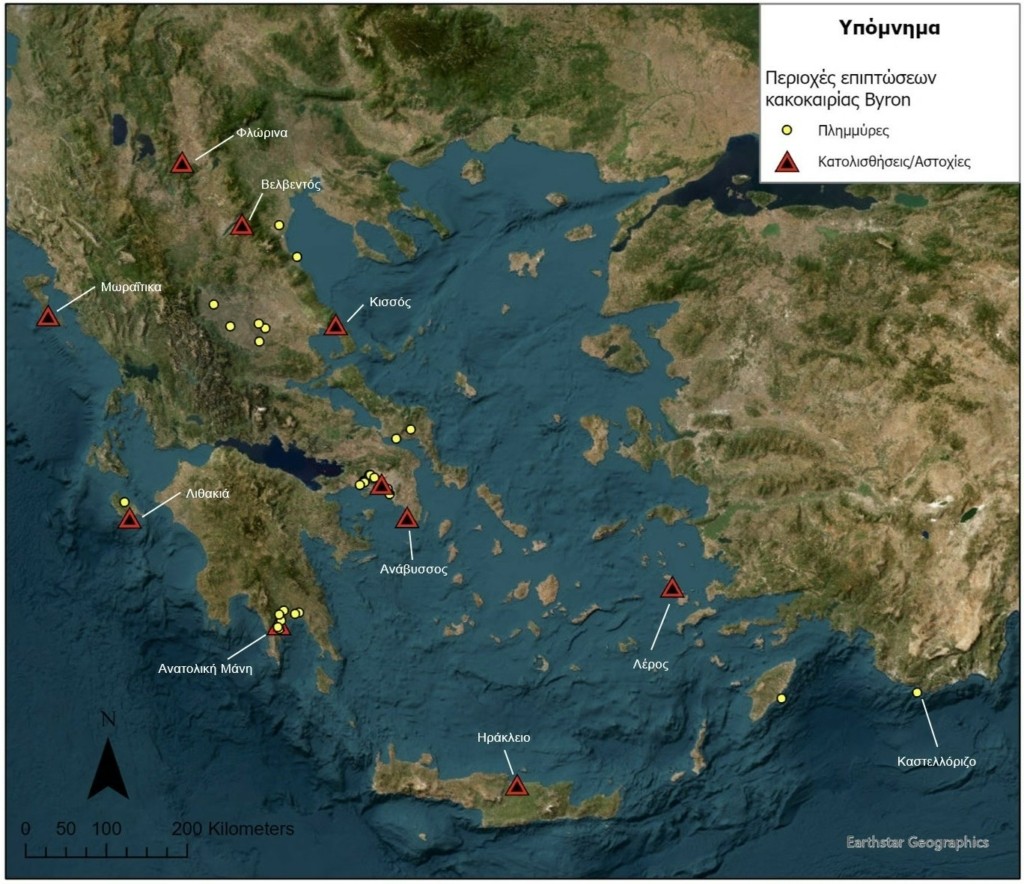 Σύμφωνα με την καταγραφή και τα ευρήματα της Διεπιστημονικής Επιτροπής Διαχείρισης Κινδύνων και Κρίσεων του ΕΚΠΑ επιπτώσεις λόγω της κακοκαιρίας “Byron” σημειώθηκαν μεταξύ άλλων σε περιοχές των περιφερειών Αττικής, Πελοποννήσου, Ιονίων Νήσων, Θεσσαλίας, Στερεάς Ελλάδας, Κεντρικής Μακεδονίας, Δυτικής Μακεδονίας, Νοτίου Αιγαίου (ιδιαίτερα στα Δωδεκάνησα).