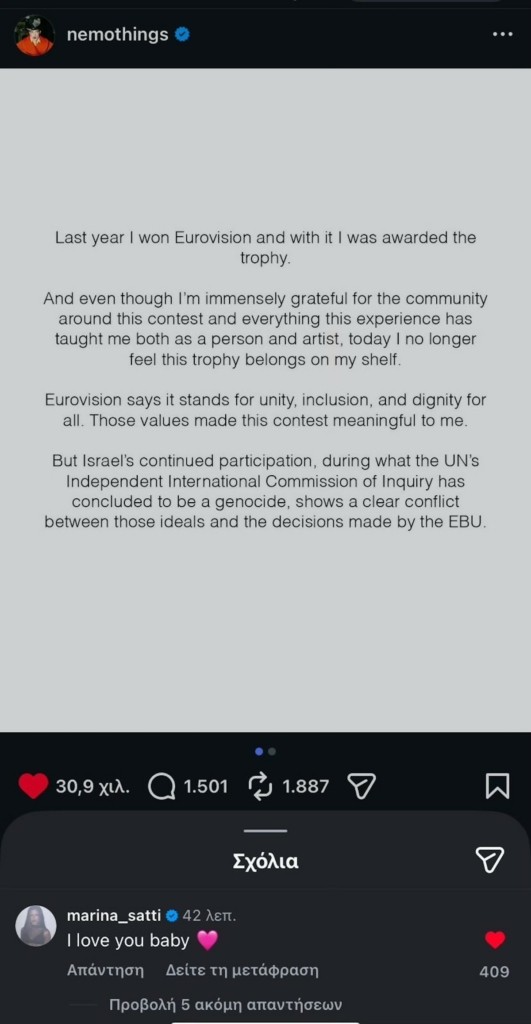 Στο πλευρό του Nemo για την απόφασή του να επιστρέψει το βραβείο για την πρώτη θέση στη Eurovision του 2024 λόγω της συμμετοχής του Ισραήλ στον φετινό διαγωνισμό τάχθηκε και η Μαρίνα Σάττι.