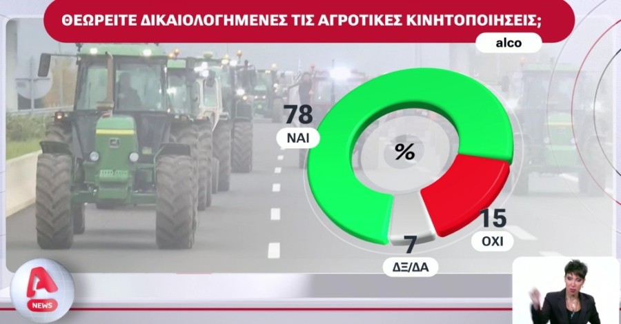 Συγκεκριμένα, στις αγροτικές κινητοποιήσεις το 78% λέει πως είναι δικαιολογημένες, ενώ διαφωνεί το 15%. Σύμφωνα με τον πρόεδρο της Alco 6 στους 10 ψηφοφόρους της ΝΔ συμφωνεί.