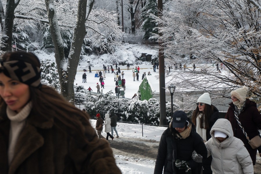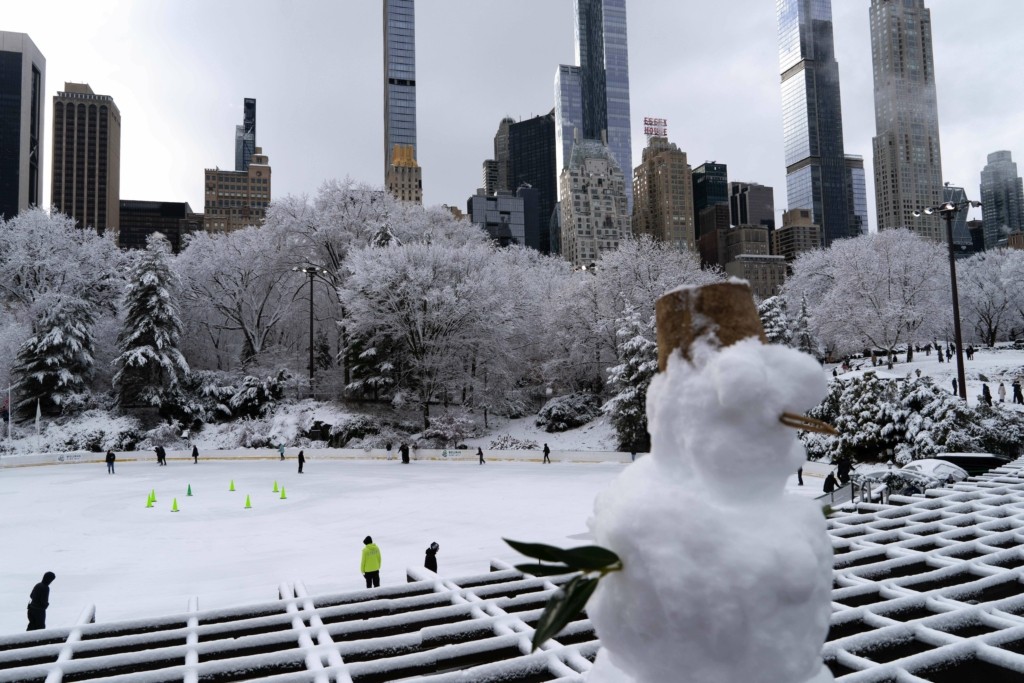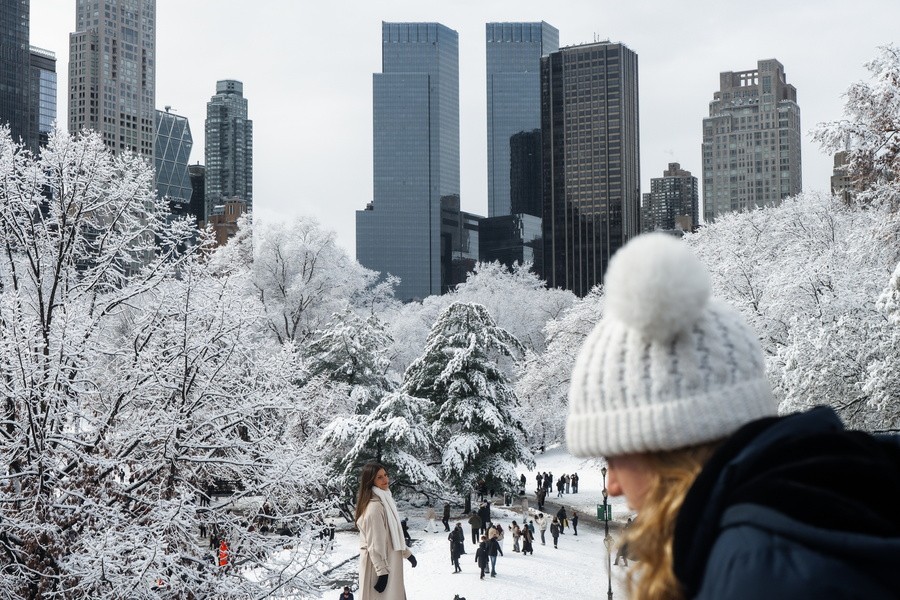 Κεντρικό σημείο αναφοράς, το εμβληματικό Central Park, με τα δέντρα και τα μονοπάτια να ντύνονται στα λευκά την Κυριακή μετά την πρώτη ισχυρή χιονόπτωση της φετινής σεζόν.