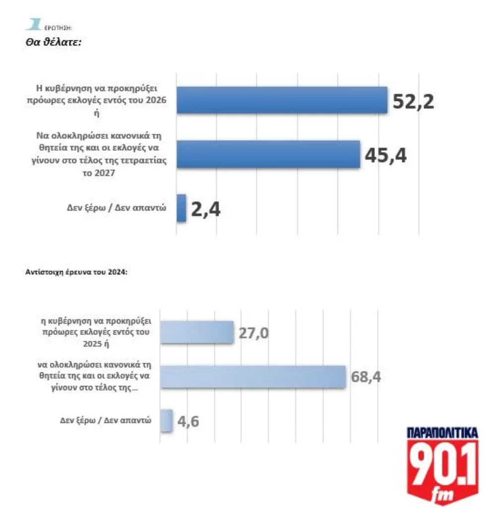 Σε αντίθεση, λοιπόν, με το 2024, όταν μόνο το 27% ζητούσε πρόωρες εκλογές, σήμερα υπέρ της πρόωρης προσφυγής στις κάλπες τάσσεται το 52,2% έναντι 45,4% που συνεχίζει να επιθυμεί εκλογές στο τέλος της τετραετίας.
