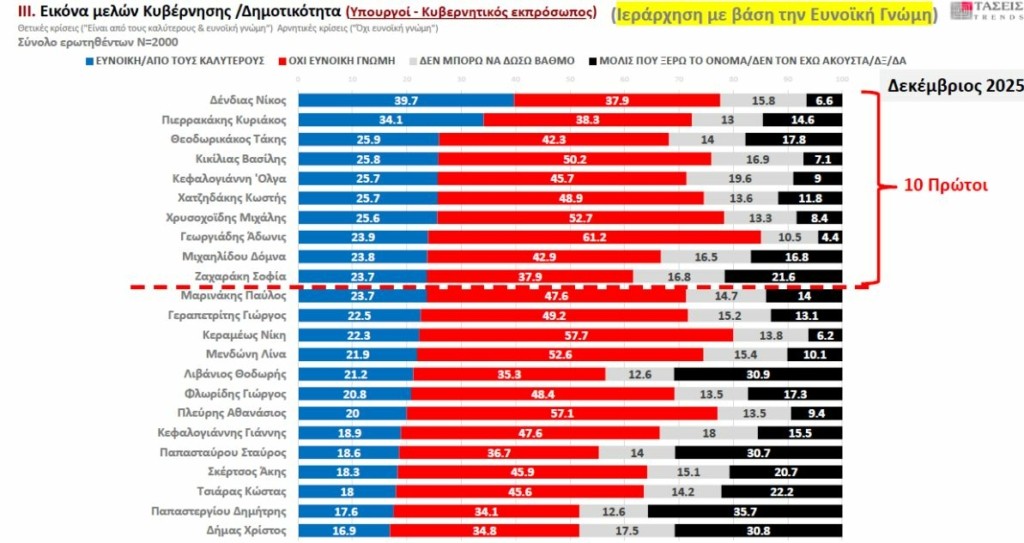Ο Άδωνις Γεωργιάδης βρίσκεται στην 8ή θέση, μάλλον πιο χαμηλά απ’ όσο θα περίμενε κανείς και τη δεκάδα κλείνουν η Δόμνα Μιιχαηλίδου και η Σοφία Ζαχαράκη, μάλλον σε ένα εύρημα έκπληξη.