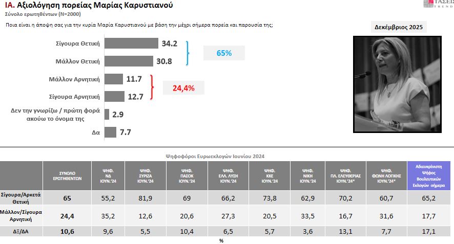 Ενδεικτικό της αποδοχής που έχει η Μαρία Καρυστιανού στον κόσμο είναι ότι το 65% δηλώνει πως την αξιολογεί θετικά για τις ενέργειές της.