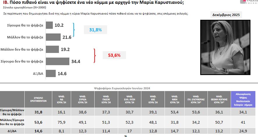 Στο ερώτημα αν θα την ψήφιζαν, το 31,8% απάντησε «σίγουρα» ή «μάλλον ναι», με το «σίγουρα» να φτάνει το 10,2%.