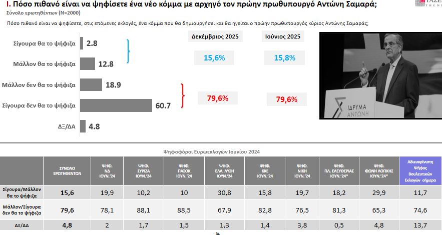 Για τον Αντώνη Σαμαρά, μόλις το 2,8% λέει πως θα τον ψήφιζε «σίγουρα» εάν ίδρυε νέο κόμμα, ενώ συγκεντρωτικά μαζί με το ποσοστό που «μάλλον» θα τον ψήφιζε, φτάνει στο 15,8%. Οκτώ στους 10 απαντούν αρνητικά.