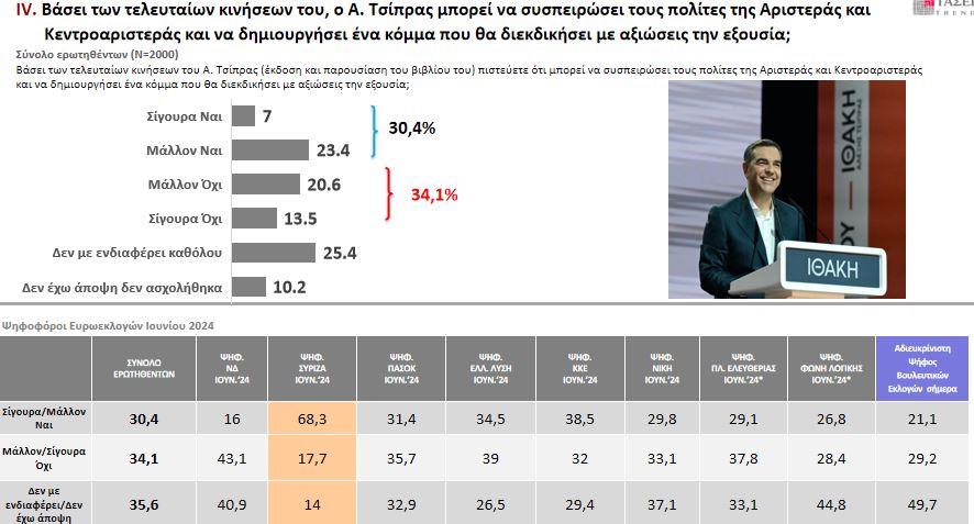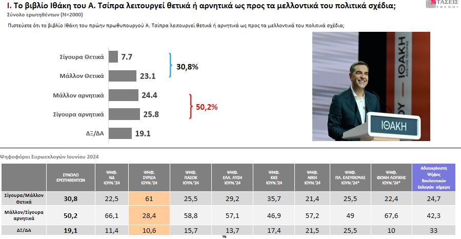 Στο ερώτημα αν το βιβλίο «Ιθάκη» λειτουργεί θετικά για τα πολιτικά σχέδιο του Αλ. Τσίπρα, ο ένας στους δύο (50,2%) απάντησε «αρνητικά», ενώ ένα 30,8% το βλέπει θετικά.
