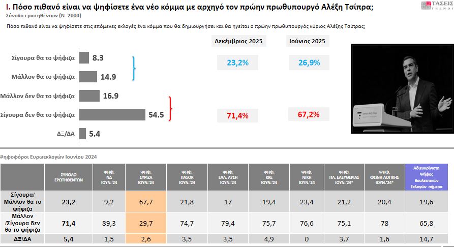 Το ποσοστό αποδοχής και στήριξης ενός νέου κόμματος από τον Αλέξη Τσίπρα, φτάνει στο 23,2% με το 67,7% των υποστηρικτών του ΣΥΡΙΖΑ να δηλώνει πως θα τον ψηφίσει στις επόμενες εκλογές.