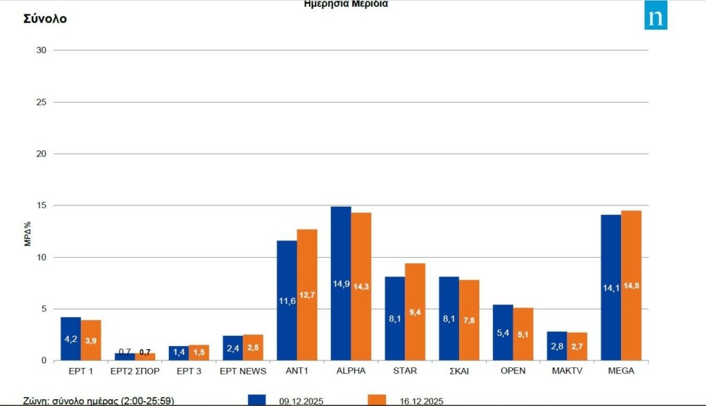 Ανοδικά κινήθηκε ο δείκτης της Nielsen σε ΑΝΤ1, Star, ΕΡΤ1 και MAK TV. Το πρώτο κανάλι της κρατικής τηλεόρασης για λίγο δεν είδε το 4 στο μερίδιο του και πάντως απέχει πολύ από επιδόσεις 5% και άνω. Τελευταία φορά που η Nielsen σημείωσε επίδοση τέτοιου μεγέθους για την ΕΡΤ1 ήταν στις 26 Σεπτεμβρίου (5,2%).