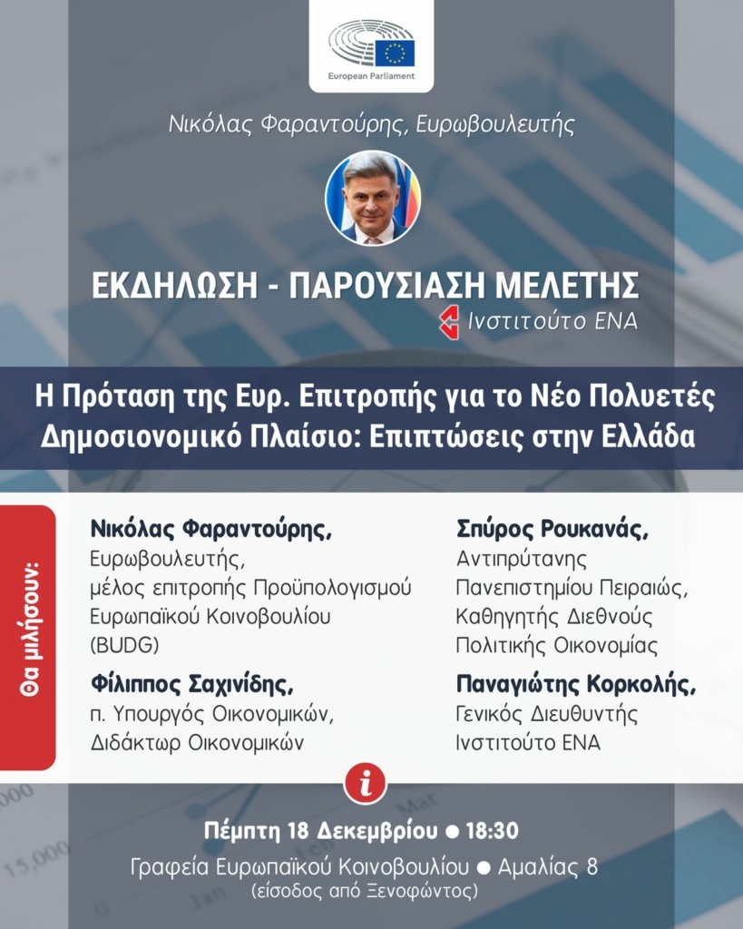 Στις 18:30 λοιπόν, στα γραφεία του Ευρ.Κοινοβουλίου στην Αθήνα θα παρουσιαστεί αναλυτική μελέτη του Ινστιτούτου ΕΝΑ για το πώς θα επηρεαστεί η ελληνική οικονομία τα επόμενα χρόνια απ’ τις προτάσεις της Ευρ. Επιτροπής για τον ευρωπαϊκό προϋπολογισμό. Επ’ αυτής θα γίνει και η συζήτηση.