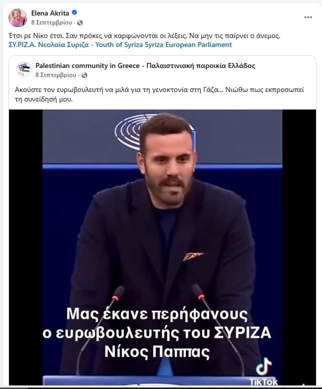 Το θέμα της ομιλίας δεν έχει σημασία, καθότι κι άλλοι έλεγαν ανάλογα πράγματα και εξέφραζαν τις ίδιες απόψεις. Όμως η Ακρίτα επέλεγε να συγκινηθεί από τον Παππά. Έχει ενδιαφέρον να μας πει τι λέει τώρα… Είναι ακόμα φαν του ευρωβουλευτή;