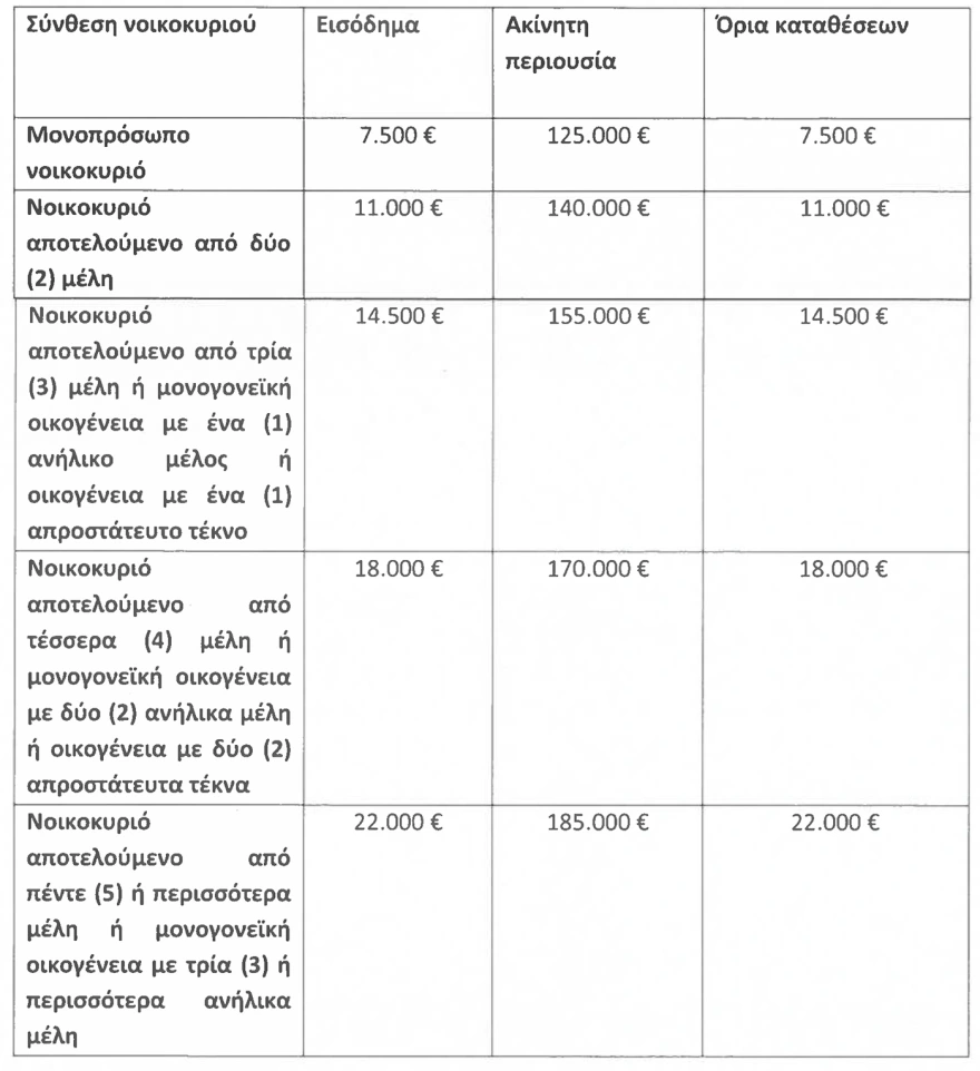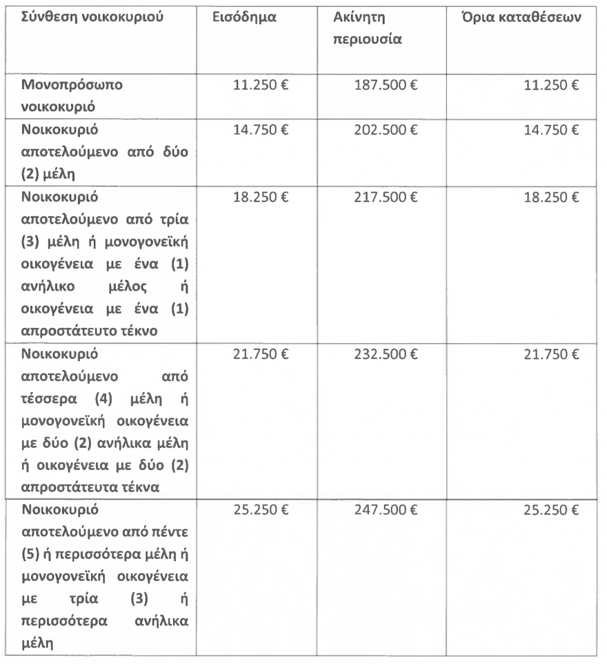 Τα εισοδηματικά και περιουσιακά κριτήρια στις τρεις προβλεπόμενες κατηγορίες είναι – ανάλογα με τη σύνθεση του νοικοκυριού (από μονοπρόσωπο νοικοκυριό έως οικογένεια αποτελούμενη πάνω από 5 μέλη)– τα εξής: