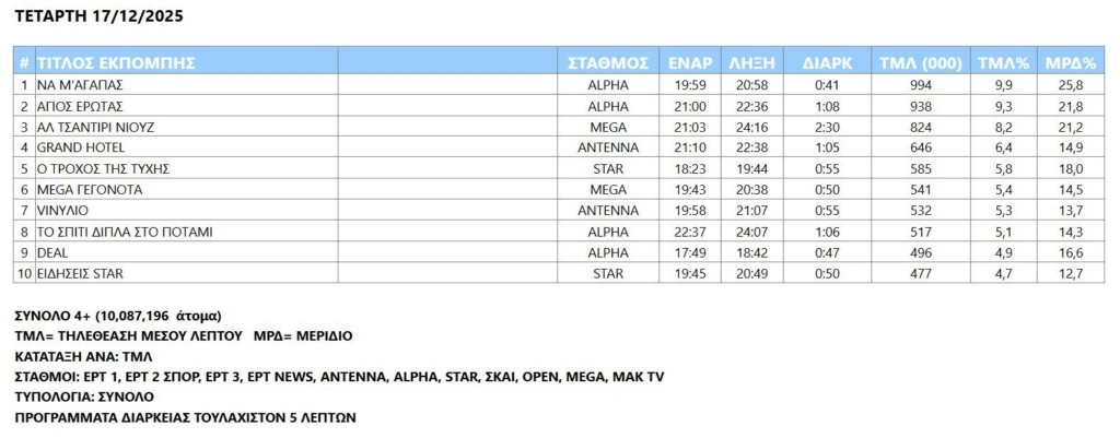 Τρίτη επιλογή ήταν το «Αλ Τσαντίρι νιουζ» του Λάκη Λαζόπουλου, το τελευταίο της χρονιάς που «φεύγει». Την τετράδα συμπλήρωσε το «Grand Hotel» με τον «Τροχό της τύχης» ακριβώς στη μέση της 10άδας με τις δημοφιλέστερες εκπομπές της ημέρας, σύμφωνα με τις μετρήσεις της Nielsen.