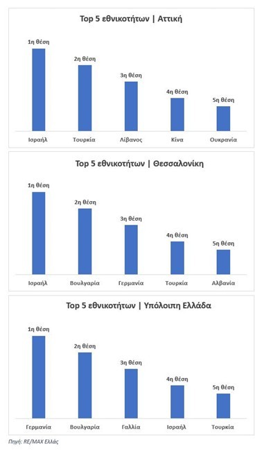Στην υπόλοιπη χώρα, το ενδιαφέρον στρέφεται περισσότερο προς τουριστικές και παραθεριστικές περιοχές. Εκεί, οι Γερμανοί αποτελούν την ισχυρότερη ομάδα ξένων αγοραστών, με τους Βούλγαρους και τους Γάλλους να ακολουθούν. Ισραηλινοί και Τούρκοι διατηρούν επίσης ενεργό ρόλο, κυρίως σε αγορές εξοχικής κατοικίας με προοπτικές αξιοποίησης.
