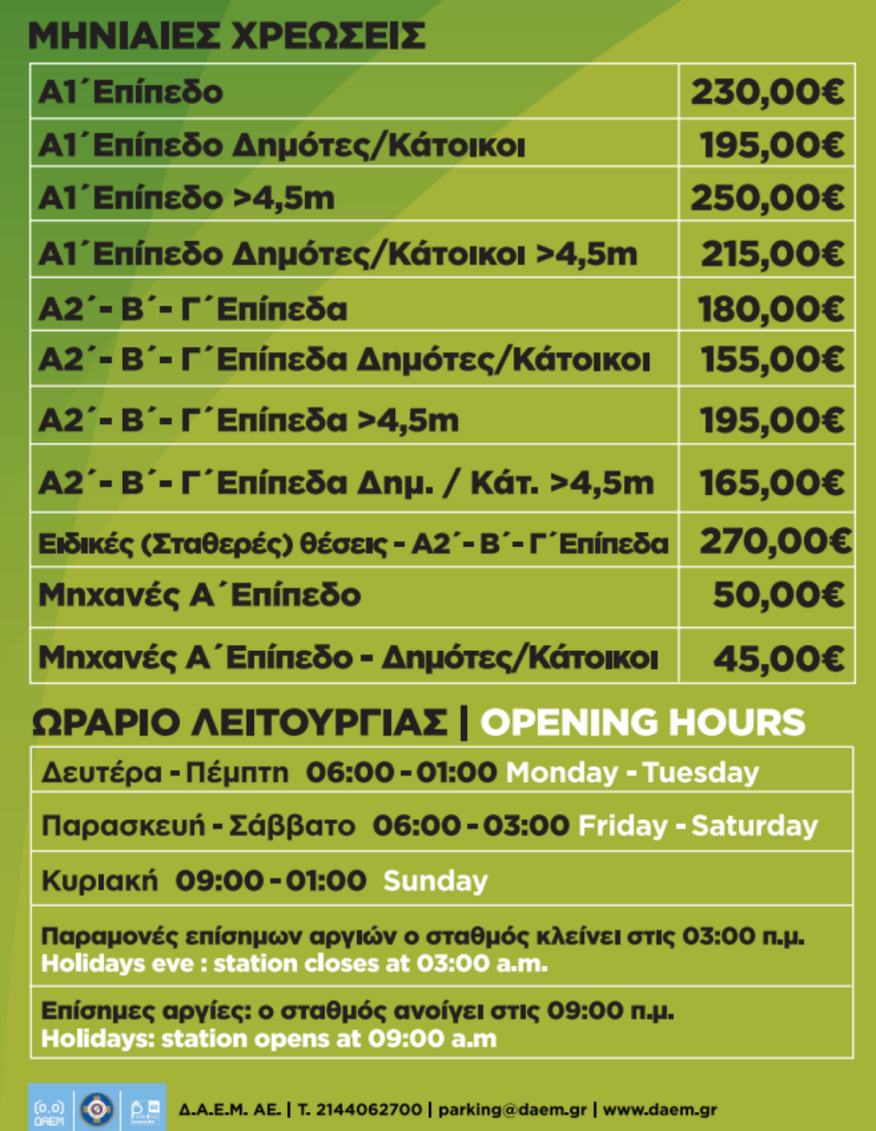 Για την εξοικείωση των πολιτών με τον νέο χώρο στάθμευσης, οι δύο (2) πρώτες ώρες στάθμευσης θα είναι δωρεάν έως το τέλος του μήνα (31/12/2025). Επιπλέον, θα ισχύει 15% έκπτωση στις μόνιμες θέσεις που κατέχουν δημότες Αθηναίων. Εντός του πάρκινγκ λειτουργεί ειδικά διαμορφωμένος χώρος για τη δωρεάν στάθμευση των ποδηλάτων.