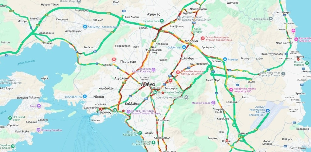 Ιδιαίτερα αυξημένη είναι η κίνηση στους δρόμους της Αθήνας, με το μεγαλύτερο πρόβλημα να εντοπίζεται σε Κηφισό, Κηφισίας και Αττική Οδό.