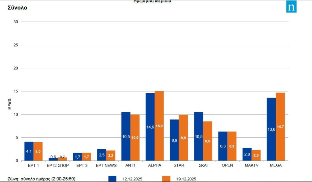 Το Star είδε τη δυναμική του να διαμορφώνεται ελάχιστα κάτω από το 10%, σταθερός διατηρήθηκε ο ΣΚΑΪ σε σχέση με την Πέμπτη, ενώ το Open πρόσθεσε μια ποσοστιαία μονάδα στη δυναμική του επιβεβαιώνοντας ότι η Παρασκευή αποτελεί τη «δυνατή» του ημέρα.