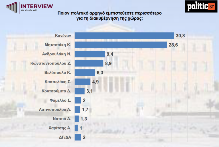 Όσον αφορά στην εμπιστοσύνη προς τους πολιτικούς, το 30,8% αναφέρει πως δεν εμπιστεύεται κανέναν πολιτικό αρχηγό για το «τιμόνι» της χώρας, ενώ στη δεύτερη θέση είναι ο Κυριάκος Μητσοτάκης με 28,6% και ακολουθούν οι υπόλοιποι πολιτικοί αρχηγοί σε μονοψήφια νούμερα.