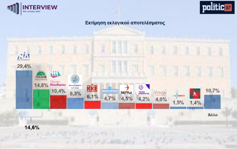 Στην εκτίμηση αποτελέσματος η ΝΔ έχει 29,4%, το ΠΑΣΟΚ 14,8%, η Πλεύση Ελευθερίας 10,4% και η Ελληνική Λύση 8,3%.