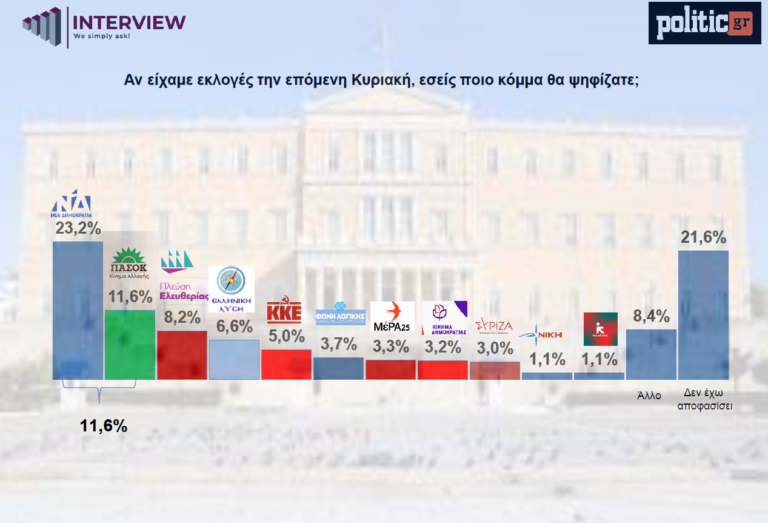 Περνώντας στα πιο… πολιτικά στοιχεία της δημοσκόπησης, στην πρόθεση ψήφου η ΝΔ συγκεντρώνει ποσοστό 23,2%, στη δεύτερη θέση παραμένει το ΠΑΣΟΚ με 11,6% ενώ η Πλεύση Ελευθερίας έχει εδραιωθεί στην 3η θέση με ποσοστό 8,2% και ακολουθούν η Ελληνική Λύση με 6,6%, το ΚΚΕ με 5,0%