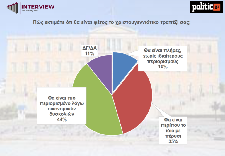 Με τις γιορτινές να πλησιάζουν, η δημοσκόπηση ρωτά τους πολίτες πώς θα είναι το φετινό χριστουγεννιάτικο τραπέζι, με το 44% να εκτιμά ότι θα είναι πιο «φτωχικό» από πέρσι, το 35% «μια από τα ίδια» και μόνο το 10% το περιμένει πιο πλούσιο.