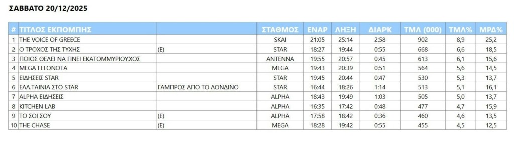 Δυνατότητα… πρώτου καναπέ πίστα προσφέρει από την άνεση και την ενδυματολογική χαλαρότητα του σπιτιού το «The Voice of Greece», το οποίο ήταν πρώτη επιλογή των τηλεθεατών το Σάββατο, ημέρα που παίρνει το… ρεπό η τυπολογία των σειρών ελληνικής μυθοπλασίας σε συνέχειες νέας εσοδείας. Το γενικότερο είδος προγράμματος εκπροσωπήθηκε από σε επανάληψη επεισόδια της σειράς «Το σόι σου».