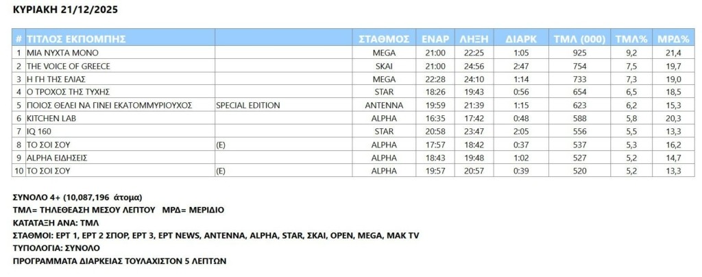 Την Κυριακή τα τηλεοπτικά γούστα δεν άλλαξαν. Πρώτευσε η σειρά «Μια νύχτα μόνο», με το «The Voice of Greece», ναι μεν δεύτερη επιλογή, αλλά με σημαντική διαφορά δυναμικότητας.