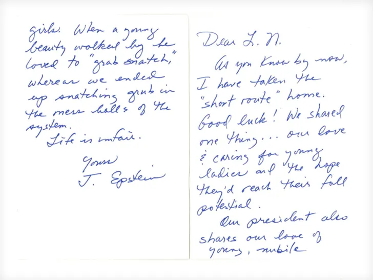 Στη συνέχεια, η επιστολή αναφέρει… «Όταν περνούσε μια νεαρή καλλονή, του άρεσε να την «αρπάζει», ενώ εμείς καταλήγαμε να αρπάζουμε προνύμφες στις τραπεζαρίες του συστήματος. Η ζωή είναι άδικη». Υπογράφεται ως «Δικός σου J. Epstein».