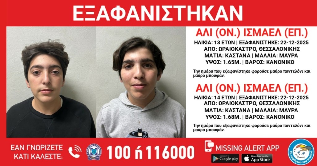 Συναγερμός έχει σημάνει στην περιοχή του Ωραιοκάστρου Θεσσαλονίκης, μετά την εξαφάνιση ενός 13χρονου κι ενός 14χρονου από χώρο φιλοξενίας ασυνόδευτων ανηλίκων τη Δευτέρα (22/12).