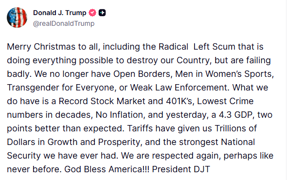 Στο εορταστικό του μήνυμα στα κοινωνικά δίκτυα, ο Τραμπ συνδύασε τις ευχές με έναν απολογισμό της θητείας του, τονίζοντας ότι οι Ηνωμένες Πολιτείες «δεν έχουν πλέον ανοιχτά σύνορα, άνδρες στα γυναικεία αθλήματα, τρανς άτομα για όλους ή αδύναμη επιβολή του νόμου». Όπως υποστήριξε, η χώρα καταγράφει «ρεκόρ χρηματιστηρίου, τα χαμηλότερα ποσοστά εγκληματικότητας εδώ και δεκαετίες, καθόλου πληθωρισμό και ΑΕΠ 4,3%, δύο μονάδες πάνω από τις εκτιμήσεις».