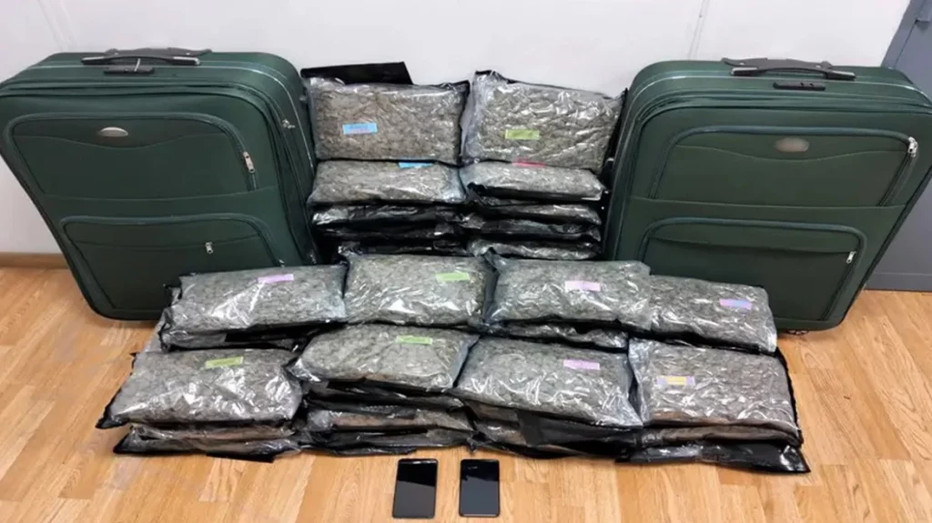 Από τον έλεγχο που πραγματοποιήθηκε στις αποσκευές της, βρέθηκε να έχει αποκρύψει σε νάιλον συσκευασίες, 24 κιλά και 500 γραμμάρια ακατέργαστης κάνναβης υδροπονικής καλλιέργειας (skunk).