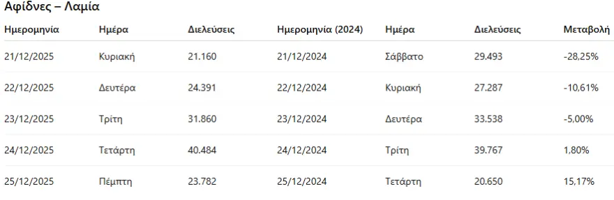 Ωστόσο, όταν εξετάζεται η συνολική εικόνα της οδικής εξόδου από την Αττική, τα στοιχεία δείχνουν αντοχή και προσαρμογή των μετακινήσεων. Από τα δύο βασικά διόδια εξόδου, Αφιδνών και Ελευσίνας, καταγράφηκαν συνολικά 314.846 διελεύσεις το 2025, έναντι 311.262 το 2024.