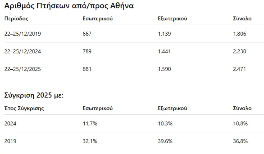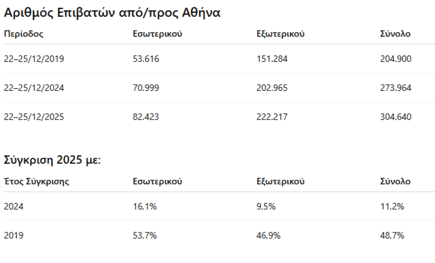Ακόμη πιο έντονη είναι η εικόνα στους επιβάτες. Συνολικά 304.640 επιβάτες διακινήθηκαν από και προς την Αθήνα την περίοδο 22 έως 25 Δεκεμβρίου, έναντι 273.964 το 2024 και 204.900 το 2019.