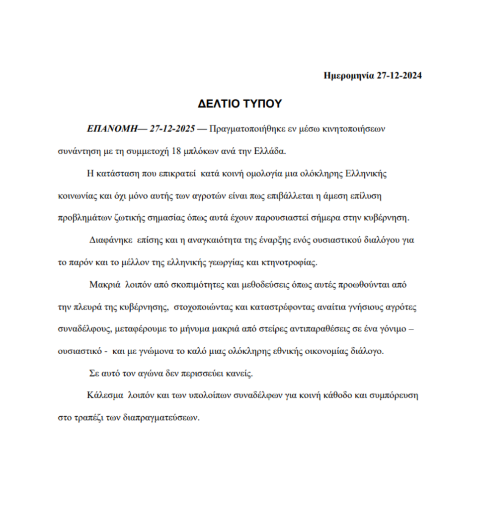 Μήνυμα προς την κυβέρνηση πως είναι ανοιχτοί στον «ουσιαστικό» διάλογο «για το παρόν και το μέλλον της ελληνικής γεωργίας και κτηνοτροφίας», υπό προϋποθέσεις, έστειλαν από την Επανομή Θεσσαλονίκης, εκπρόσωποι από 18 μπλόκα αγροτών από όλη τη χώρα.