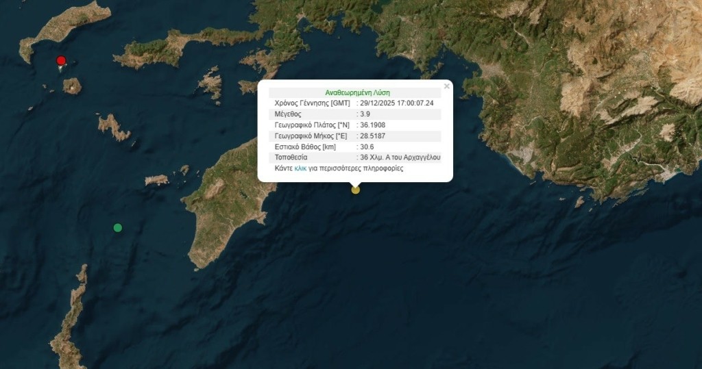 Σεισμική δόνηση, μεγέθους 3,9 βαθμών της κλίμακας Ρίχτερ, σημειώθηκε το απόγευμα της Δευτέρας, 29/12, στις 19:00, στα «ανοιχτά» της Ρόδου.