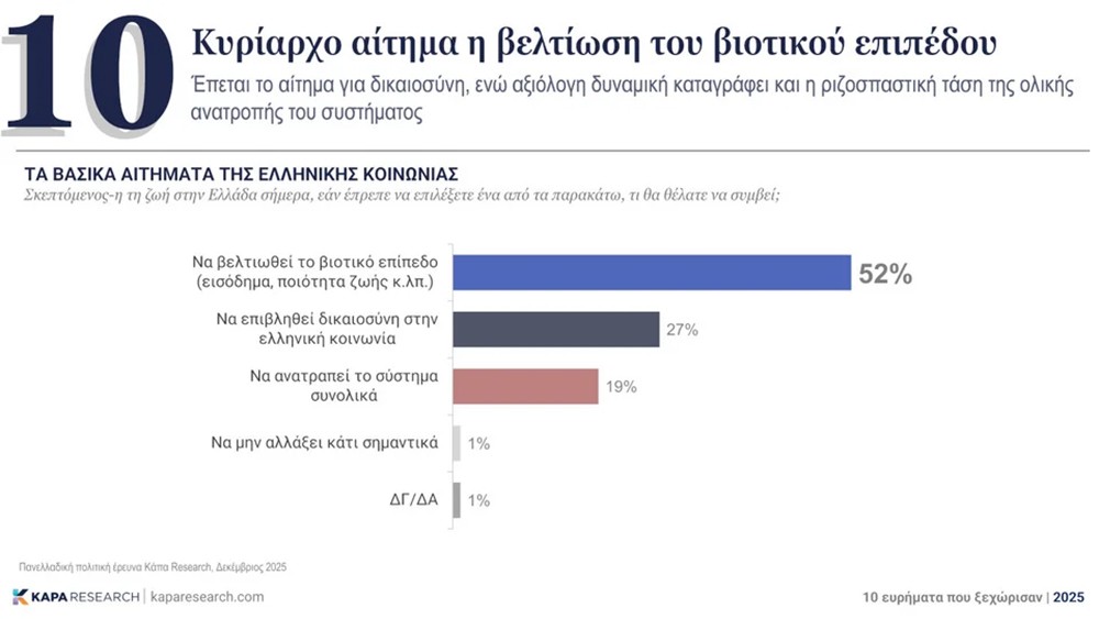 Έπεται το αίτημα για δικαιοσύνη, ενώ αξιόλογη δυναμική καταγράφει και η ριζοσπαστική τάση της ολικής ανατροπής του συστήματος.