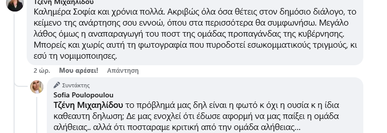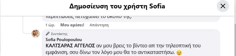 Η ίδια μάλιστα απαντά σε χρήστη που παρατηρεί το παράδοξο γεγονός ότι «αν μου βρεις το βίντεο απ’ την τηλεοπτική του εμφάνιση, σου δίνω τον λόγο μου θα το αντικαταστήσω».