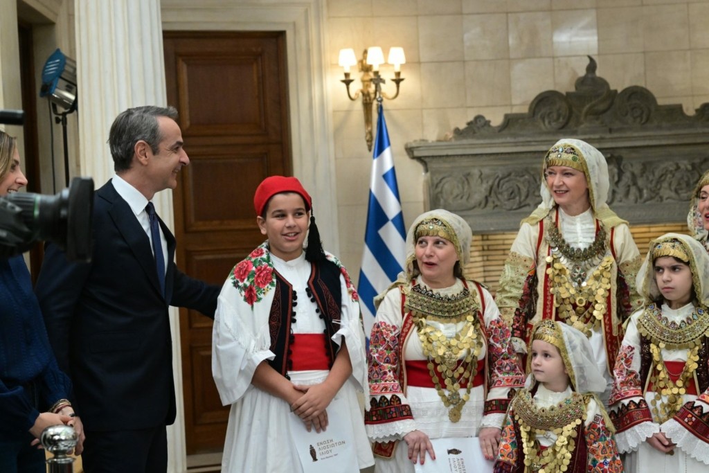 Ο πρωθυπουργός υποδέχτηκε τα μέλη του Συλλόγου, που φορούσαν τις παραδοσιακές στολές τους, με χαμόγελα και ευχές.
