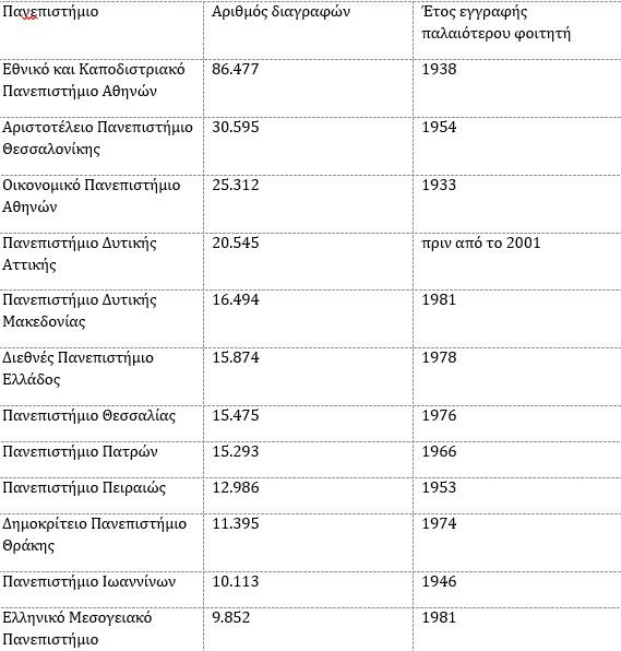 Όπως αποκαλύπτει και η Καθημερινή το Σάββατο, το ΕΚΠΑ έχει 86.477 φοιτητές να διαγράφονται από τα μητρώα του. Ακολουθεί το Αριστοτέλειο Πανεπιστήμιο Θεσσαλονίκης με 30.595 διαγραφές, το Οικονομικό Πανεπιστήμιο Αθηνών με 25.312, το Πανεπιστήμιο Δυτικής Αττικής με 20.545 –αριθμός που αντανακλά τη συγχώνευση των ΤΕΙ Αθήνας και Πειραιαιώς κατά την ίδρυσή του το 2018– και το Πανεπιστήμιο Δυτικής Μακεδονίας με 16.494 διαγραφές, κυρίως πρώην φοιτητές του ΤΕΙ Δυτικής Μακεδονίας.
