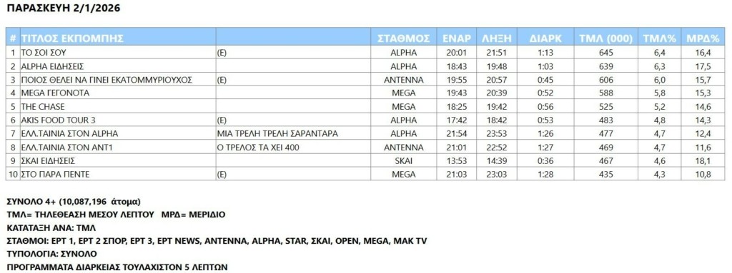 Στην ανάπαυλα της σεζόν με τις επαναλήψεις μέχρι περίπου τα μέσα του μήνα, το «Σόι σου» την περασμένη Παρασκευή ήταν πρώτο σε προτιμήσεις πρόγραμμα της ημέρας.