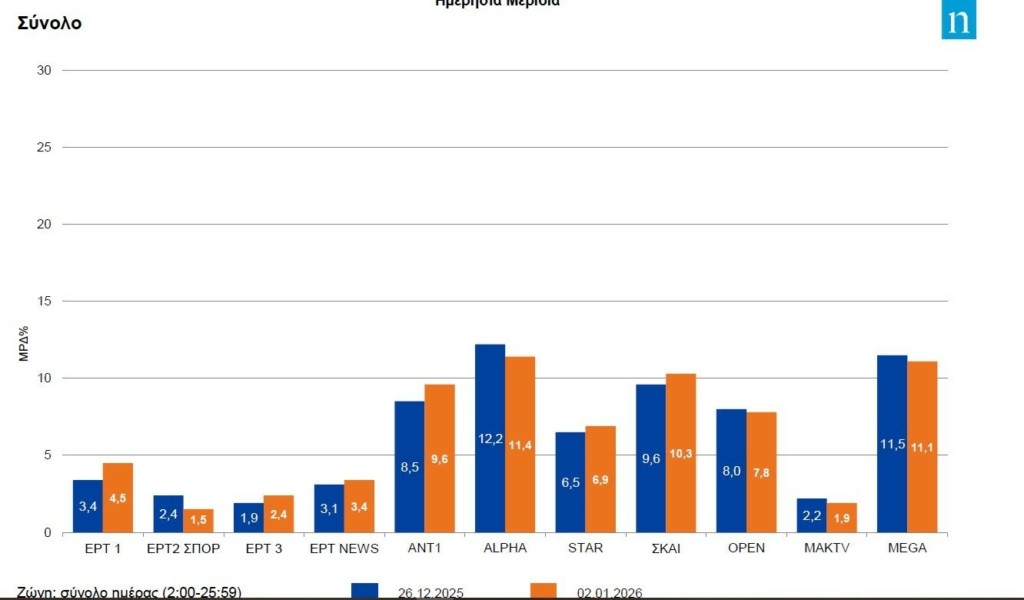 Με απόσταση-κοντής- αναπνοής από το Mega, ο Alpha κατάφερε την Παρασκευή την πρώτη… πρωτιά τηλεθέασης για το 2026. Στα αξιοσημείωτα η ανεβασμένη επίδοση του Open αλλά με καθοδική τάση συγκριτικά με τις προηγούμενες δύο ημέρες του 2025 (8,1% την Τετάρτη, 8,4% την Πέμπτη) αλλά και το 3,4% του ΕΡΤNews το οποίο, σύμφωνα με τα δεδομένα της Nielsen αποτελεί νέο «υψηλό» για το αμιγώς ειδησεογραφικό κανάλι της ΕΡΤ.