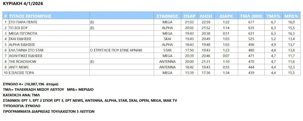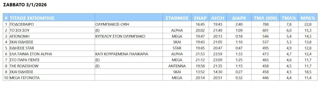Διπλή πρωτιά τηλεθέασης για το MEGA το πρώτο σαββατοκύριακο (3,4/1) του 2026